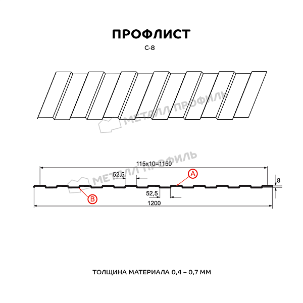 Профлист МЕТАЛЛ ПРОФИЛЬ С-8х1150-A (MattMP-20-8017-0,5) широко применяется в Нижнем Новгороде для монтажа профилированного листа. Изначально он представляет собой лист оцинкованной стали с покрытием. Общая толщина стальной основы с оцинковкой и защитно-декоративным покрытием составляет 0.5 мм. Проходя процедуру холодного проката, металл приобретает рисунок из повторяющихся волн. Несущая способность профилированного листа на порядок выше плоского.Профиль С-8: